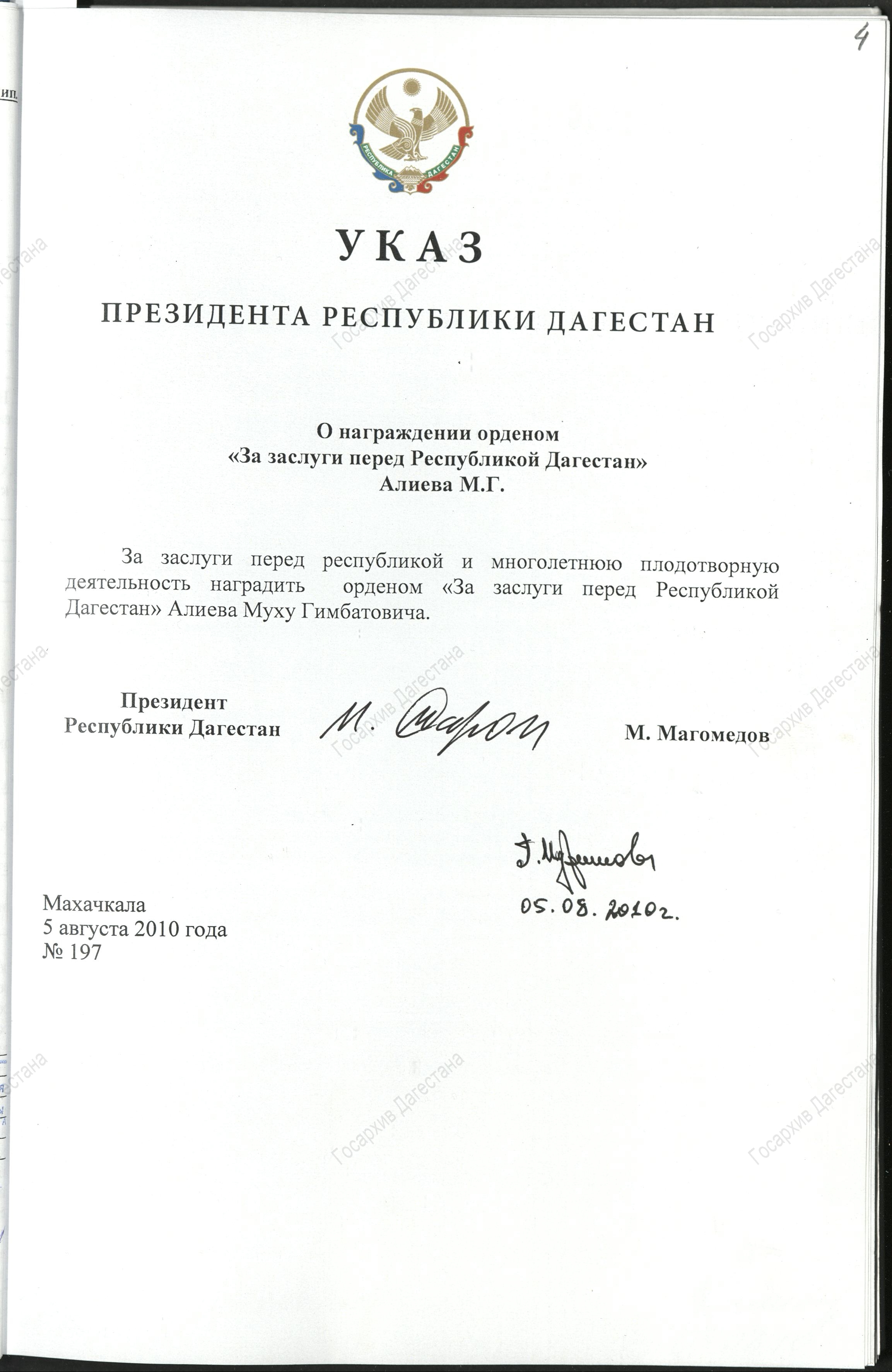 В Центральном государственном архиве Республики Дагестан хранятся личные дела, фотографии, материалы и публикации об Алиеве Муху Гимбатовиче за разные годы.