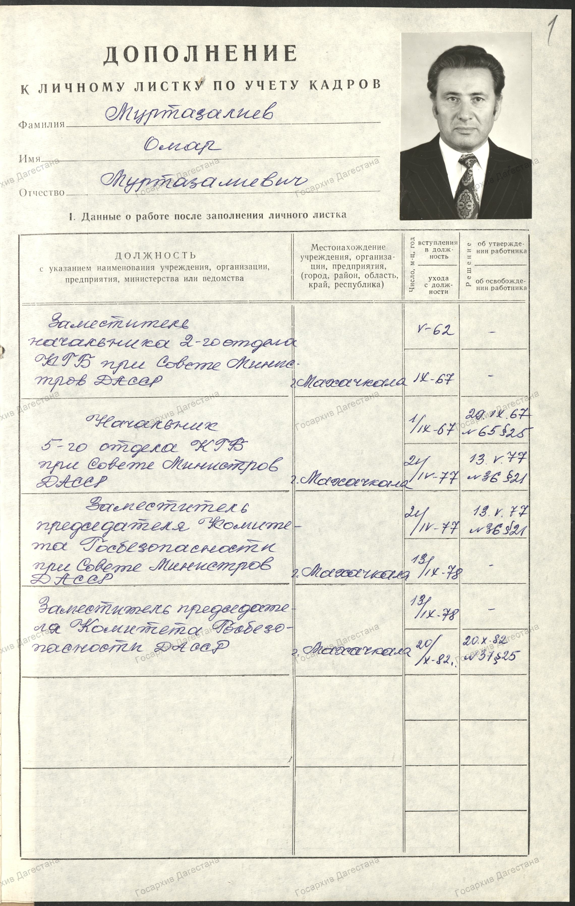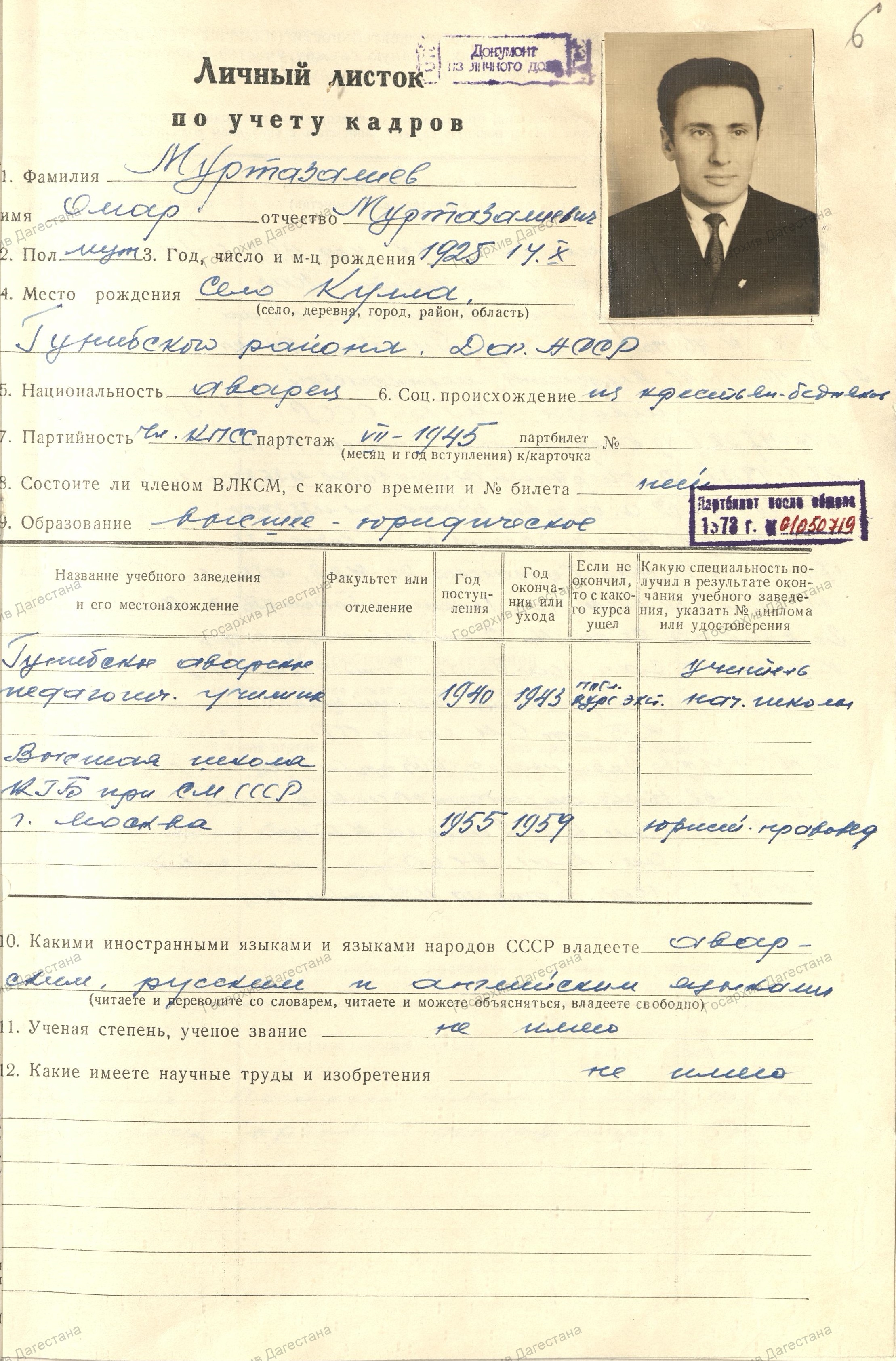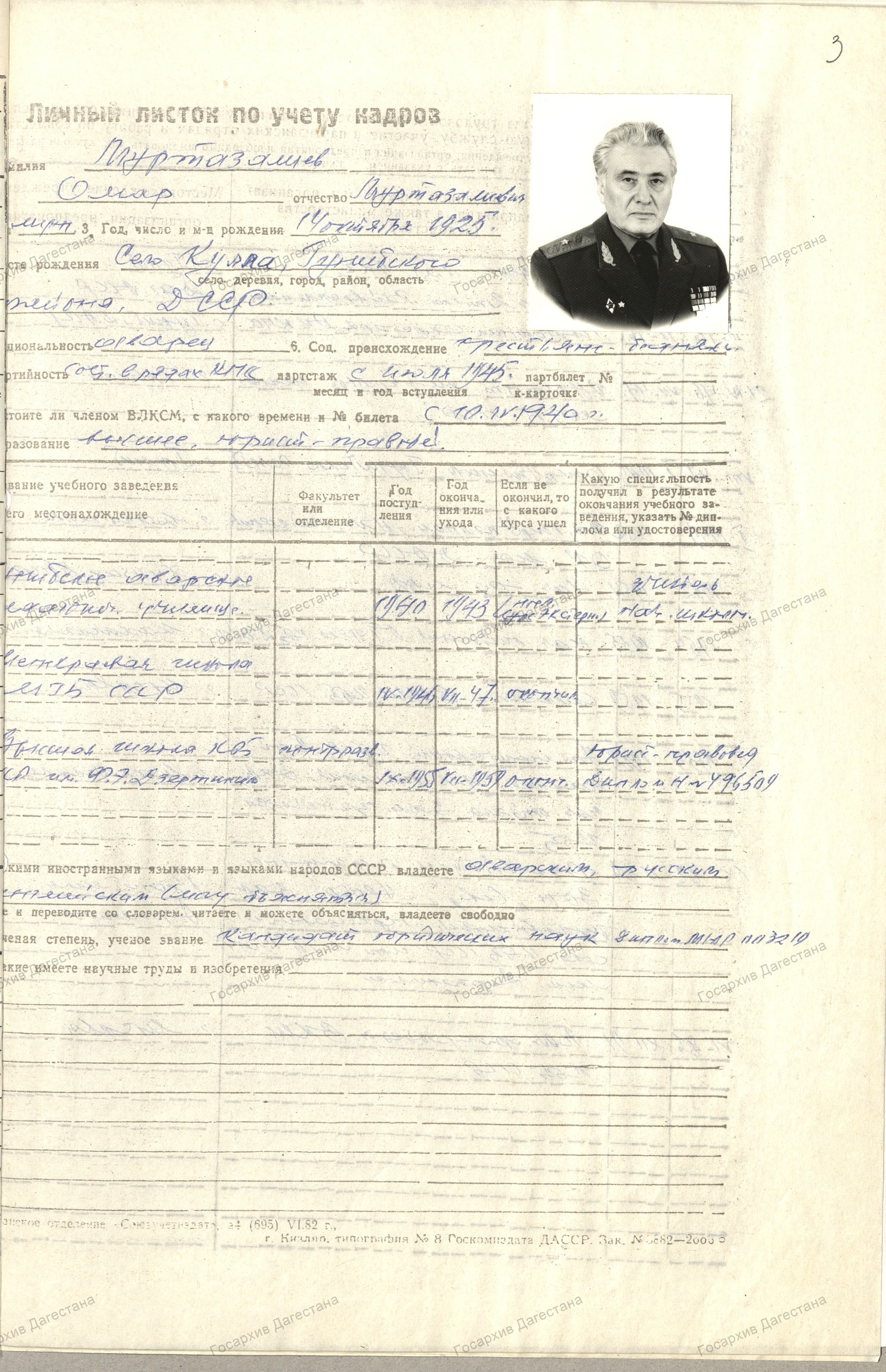 Сегодня, Муртазалиеву Омару Муртазалиевичу исполнилось бы 100 лет, родился он 14 октября 1925 года в с. Кулла Гунибского района в крестьянской семье. Ему не было и 10 лет, когда потерял мать. Трудовую деятельность начал с 16 лет в райисполкоме, затем - районном военкомате, с февраля по апрель 1946 года - помощником секретаря Гунибского РК КПСС. В апреле 1946 года решением Дагестанского обкома КПСС был направлен на работу в органы государственной безопасности. Одновременно больше года находился на учёбе в Горьковской межкраевой школе МГБ СССР. После окончания школы, дальнейшую службу проходил в органах государственной безопасности Дагестана. В 1959 году окончил Высшую школу КГБ при Совете Министров СССР им. Ф.Э. Дзержинского, защитил диссертацию с присвоением учёного звания кандидата юридических наук.