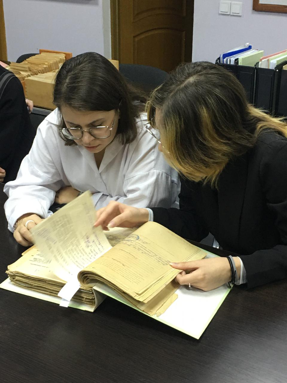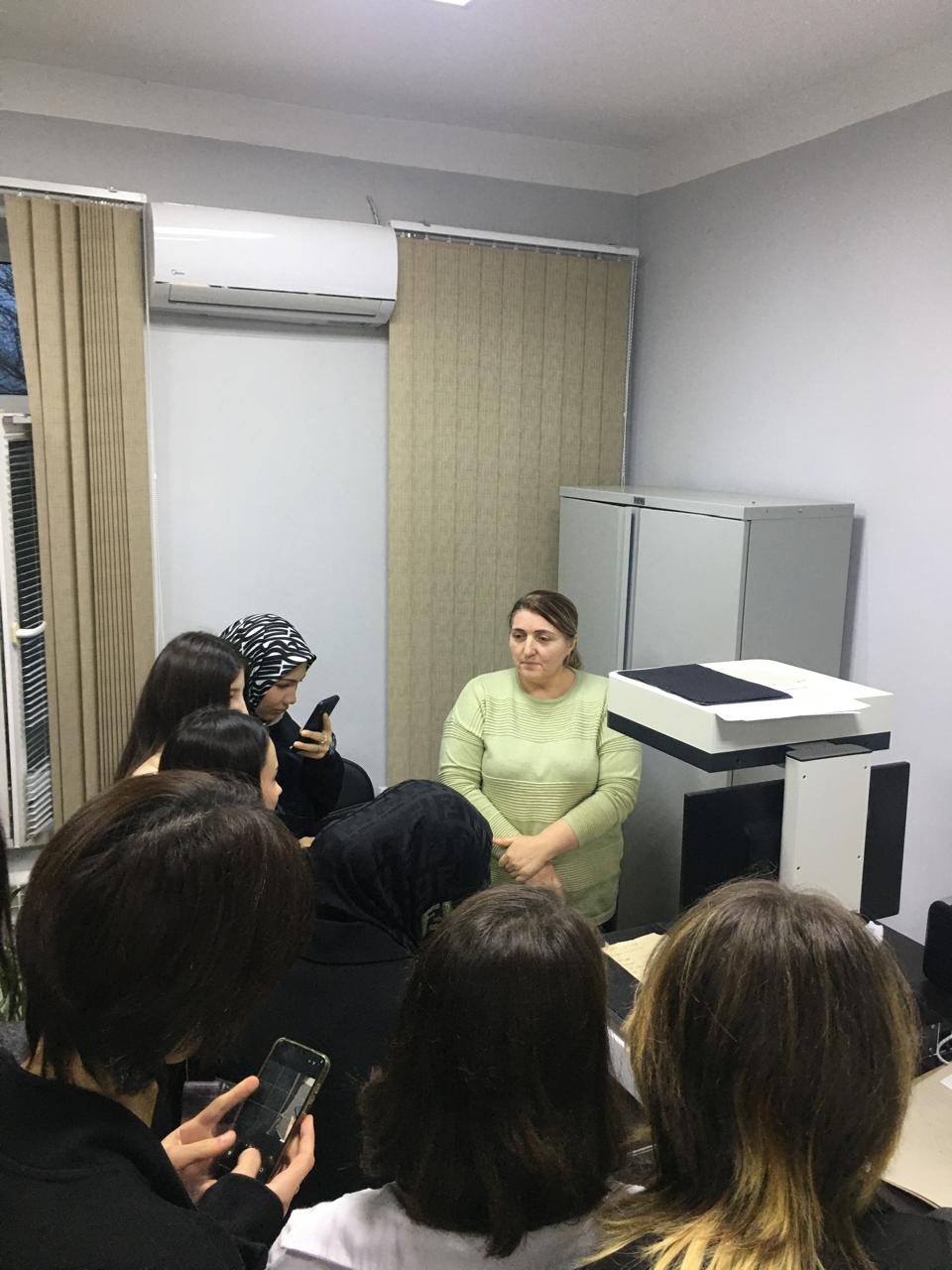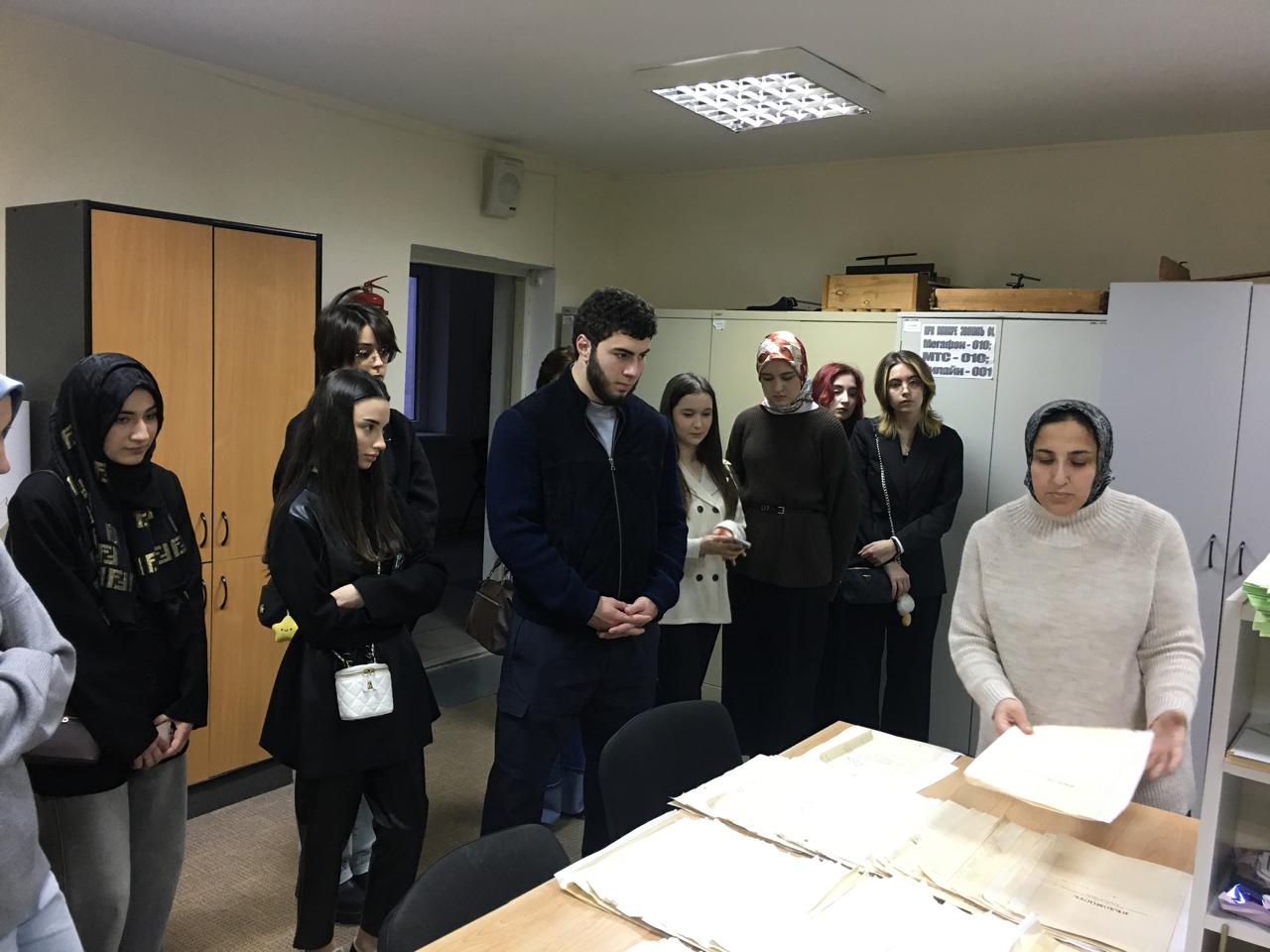 После для студентов была проведена экскурсия по архиву - хранилищу документов, отражающих историю и развитие нашей республики за разные годы. Ребята посетили научно-справочную библиотеку, читальные залы, современные архивохранилища, лабораторию по реставрации и переплету, наблюдали за созданием страхового фонда и электронного фонда пользования архивных документов.