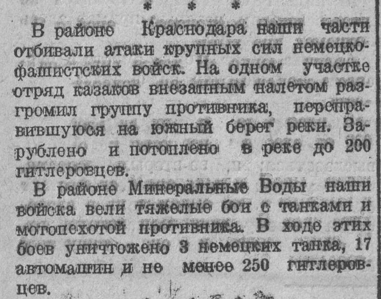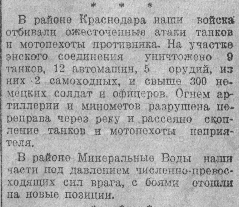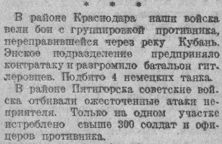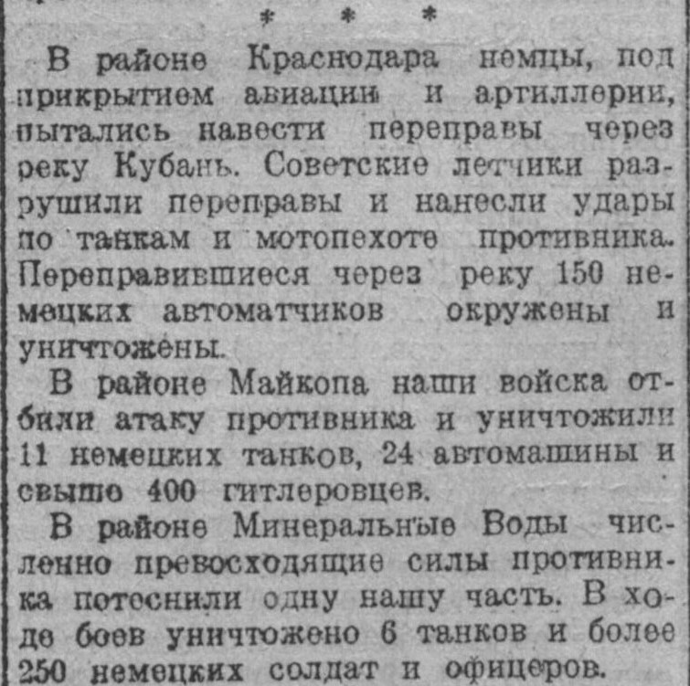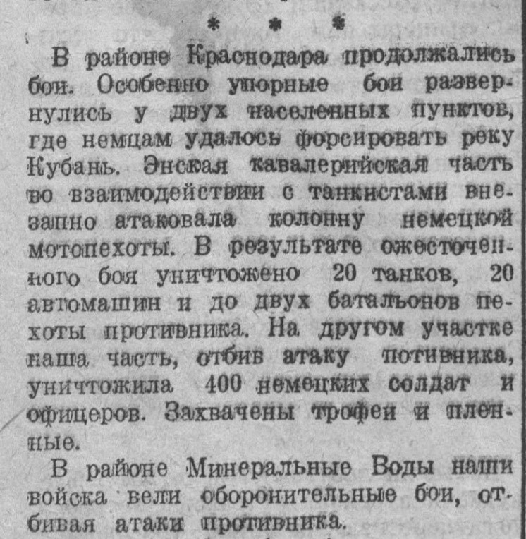 В районе Краснодара продолжались бои. Особенно упорные бои развернулись у двух населенных пунктов, где немцам удалось форсировать реку Кубань. Энская кавалерийская часть во взаимодействии с танкистами внезапно атаковала колонну немецкой мотопехоты. В результате ожесточенного боя уничтожено 20 танков, 20 автомашин и до двух батальонов пехоты противника. На другом участке наша часть, отбив атаку противника, уничтожила 400 немецких солдат и офицеров. Захвачены трофеи и пленные.