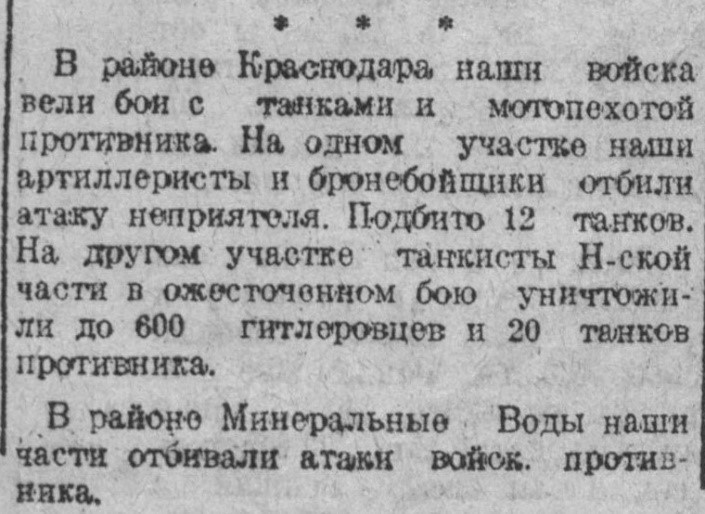 В районе Краснодара наши войска вели бои с танками и мотопехотой противника. На одном участке наши артилериссты и бронебойщики отбили атаку неприятеля. Подбито 12 танков. На другом участке танкисты Н-ской части в ожесточенном бою уничтожили до 600 гитлеровцев и 20 танков противника.