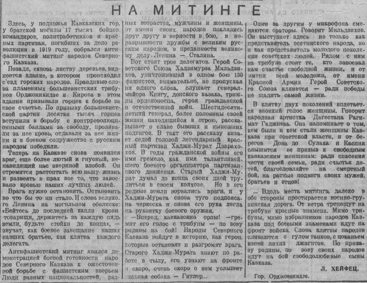 Антифашистский митинг явился демонстрацией боевой готовности народов Северного Кавказа к ожесточенной борьбе с фашистским зверьем. Люди разных национальностей, разных возрастов, мужчины и женщины, от имени своих народов поклялись друг другу в верности в бою, в неразрывности дружбы с великим русским народом, в преданности великому делу Ленина – Сталина.