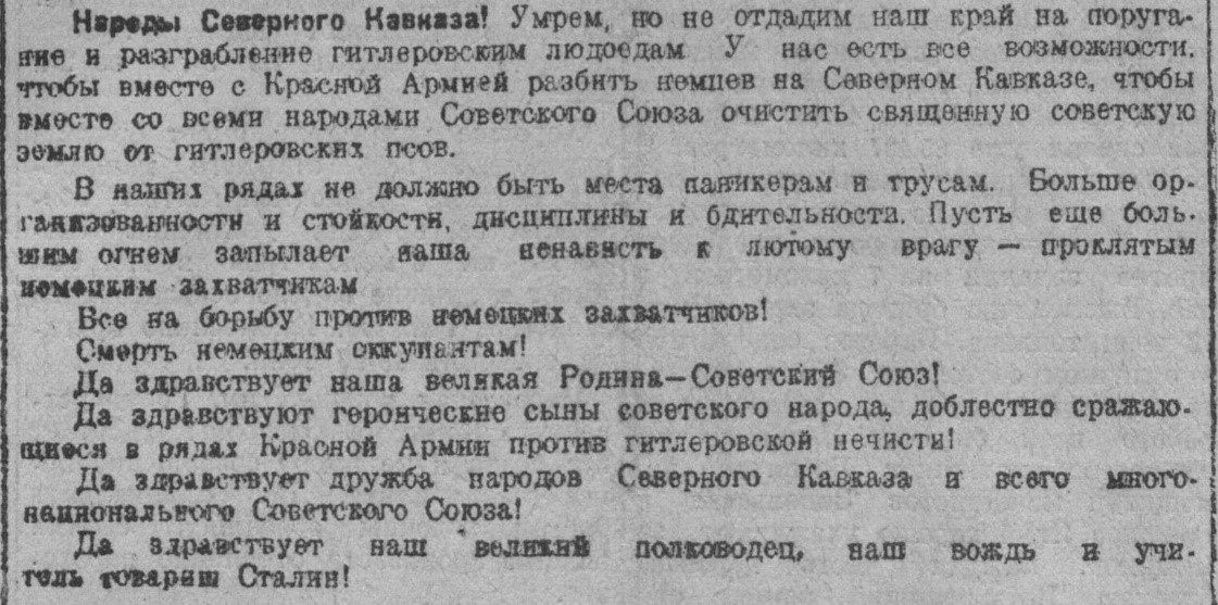 Народы Северного Кавказа! Умрем, но не отдадим наш край на поругание и разграбление гитлеровским людоедам. У нас есть все возможности, чтобы вместе с Красной Армией разбить немцев на Северном Кавказе, чтобы вместе со всеми народами Советского Союза очистить священную советскую землю от гитлеровских псов.