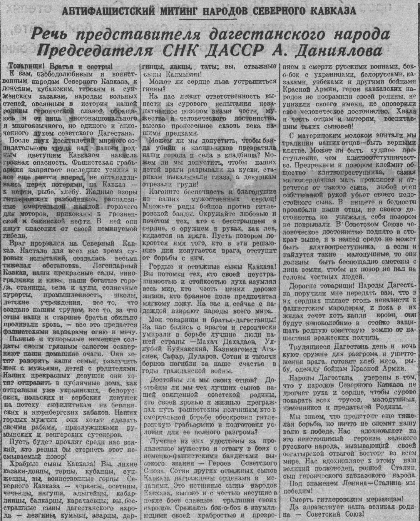 Дорогие товарищи! Народы Дагестана поручили мне передать вам, что в их сердцах пылает огонь ненависти к фашистским мародерам, и пока в их жилах течет хоть капля крови, они будут непоколебимо и стойко защищать родную советскую землю от нашествия вражеских полчищ. …